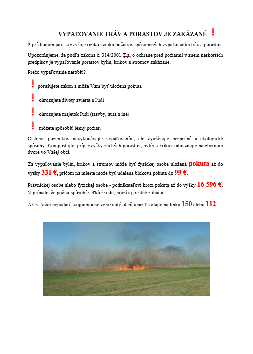 Okresné riaditeľstvo Hasičského a záchranného zboru v Galante vydáva oznam pre občanov k vypaľovaniu tráv a porastov.